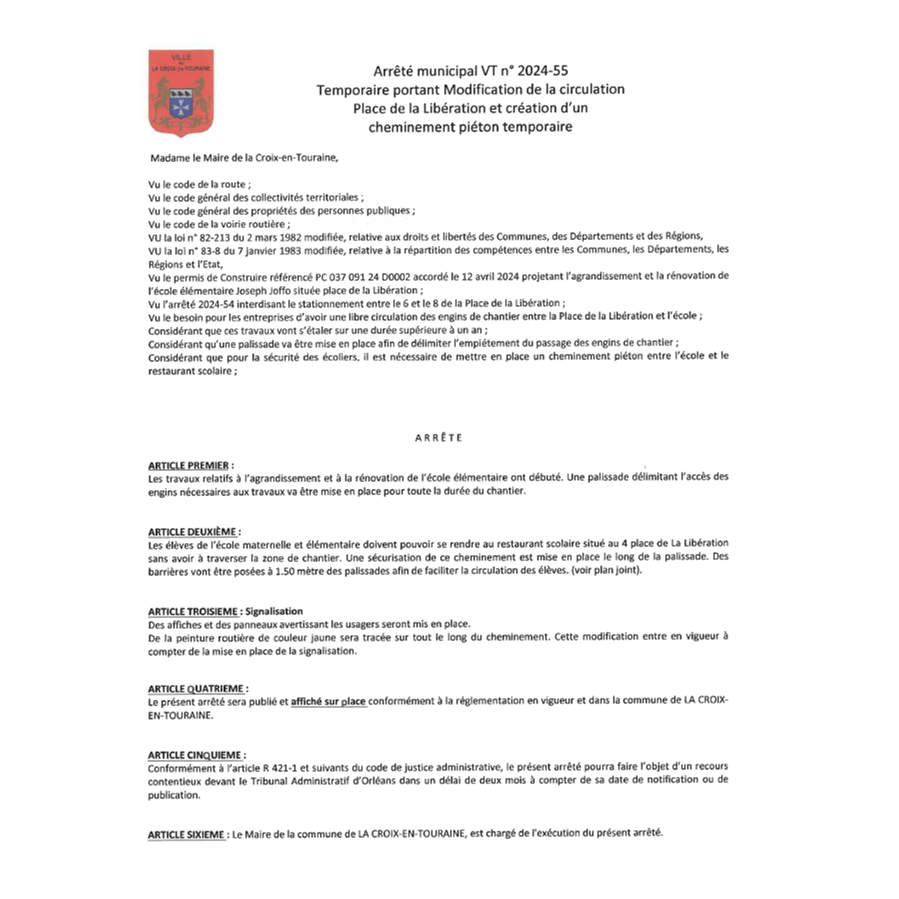 Arrêté municipal VT n° 2024-55 Temporaire portant Modification de la circulation